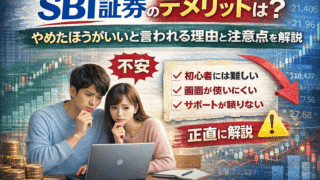 株式投資 SBI証券のデメリットは?やめたほうがいいと言われる理由と注意点を正直に解説 SBI証券はやめたほうがいい?画面が使いにくい、初心者には難しいと言われる理由など、口座開設前に知っておきたいデメリットと注意点を正直に解説します。 2025.12.22 株式投資